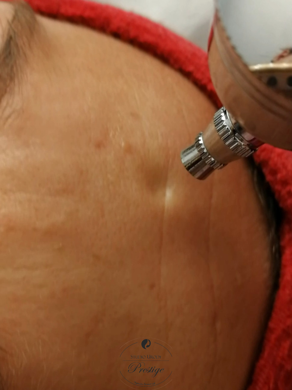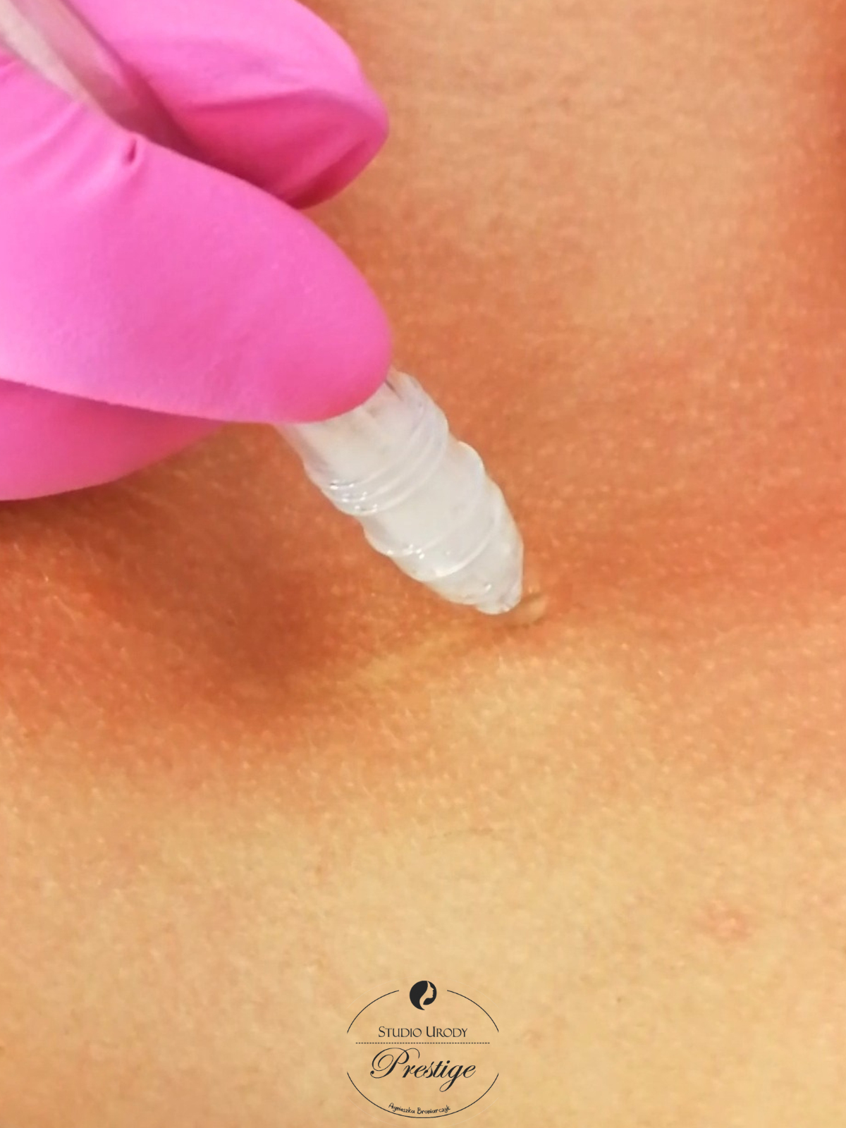 Na powierzchnię skóry pod wpływem ciśnienia zostaje wyrzucony strumień tlenu wzbogaconego mikrokroplami soli fizjologicznej złuszczającej naskórek.